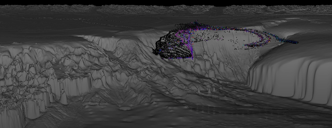 Found another set of animations of particle model output from some past work. The image below is a snapshot during the early part of the output of a simulation of the Deepwater Horizon oilspill, animations of which were ultimately used in parts of the court cases.
